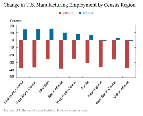 为了说明就业增长和下降的情况,下图显示了2000-10年以及2010-17年按人口普查地区划分的制造业就业变化百分比。2000-10年间,美国所有地区的人口下降幅度都很大,不过也存在一些显著差异。虽然大多数地区的就业率下降了30%到40%,但山区、西北中部和西南中部地区的就业率降幅较小。
