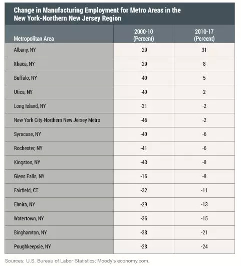 21世纪头10年间,美国各地失业情况相当普遍,但此后制造业就业的增长一直集中在美国的特定地区。事实上,这种增长主要集中在一条从密歇根南部延伸到阿拉巴马州的狭长“汽车生产走廊”上,而与此同时美国东北部的大部分地区仍在继续裁员。在离核心更近的地方,纽约和新泽西北部的许多大都会城市区都没能出现这种反弹,并且制造业岗位还在继续减少。不过值得注意的是,奥尔巴尼 (Albany) 却逆势而上,成为全美表现最强劲的地区之一。