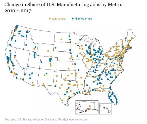 各地制造业就业岗位不均衡的反弹,持续改变着美国制造业基地的所在地。下图显示了2010-17年间,大都会城市区制造业就业份额的变化情况。我们把每个城市的制造业就业人数除以全国的就业人数。这一比例下降的大都会地区用金黄色表示,而比例上升的地区用蓝色表示。作为延续了几十年的趋势,美国东北部大部分地区和中西部许多地区制造业就业机会减少,而汽车工业、南部部分地区和西海岸大部分地区的制造业就业机会增加。