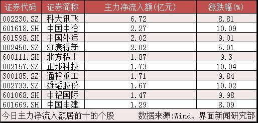 剔除尚未开板的新股,全天沪深两市主力净流入额超过1亿元的个股有14只。科大讯飞(002230.SZ)主力净流入6.72亿元,位居榜首。大基建板块聚拢市场人气,中国中治(601618.SH)率先冲上涨停板,全天主力净流入2.27亿元,中国电建大涨8%,实现主力净流入1.29亿元。次新股中国外运(601598.SH)大涨9%,全天主力净流入额为2.02亿元。