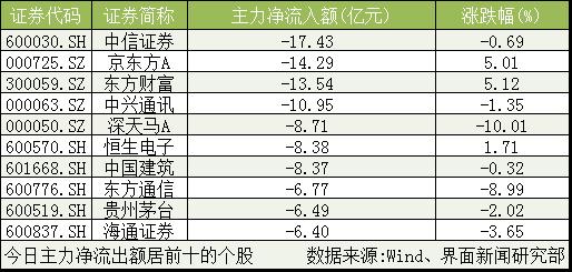 沪深两市共计148只个股主力净流出额超1亿元。本轮反弹中受主力资金热捧的中信证券(600030.SH)、京东方A(000725.SZ)、东方财富(300059.SZ)等遭遇主力巨额减持,其净流出额分别为17.43亿元、14.29亿元、13.54亿元。