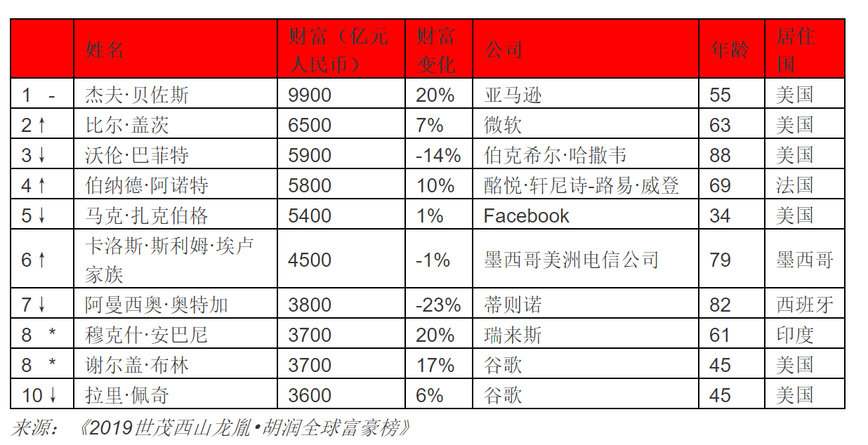 榜单前十名中有6位来自美国。杰夫•贝佐斯和穆凯什•安巴尼领涨,都增长了20%。印度瑞来斯实业61岁的穆克什•安巴尼首次跻身全球前十名。前十名平均增长4%。