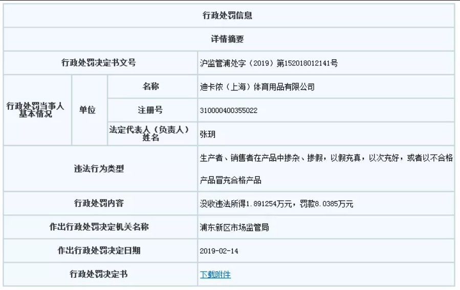 2月26日,上海市市场监管局官网公布,经查,迪卡侬(上海)体育用品有限公司于2018年2月1日起从生产商处购入款号为2514778 的针织运动服1150件,并对外出售。2018年6月22日,经检验部门检测,上述针织运动服为不合格产品,已有1147件不合格已经对外出售。据此,市场监管部门责令当事人停止销售,并对其罚款80385元、没收违法所得18912.54元。