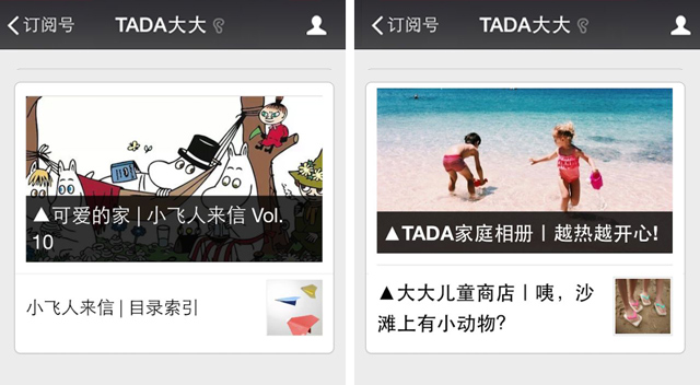 以“编辑思路”选货开店之余,Niea和特特还创办了TADA的微信公众号(tada-dada),功能介绍是“为儿童及摩登小家庭提供精选生活咨询”。它不仅仅是商店的延伸,更像是一份线上儿童杂志,有着编辑思维和独立内容,涵盖艺术、设计、文化等泛生活领域,分享童趣的短片、书籍、以及原创访谈和文学专栏。譬如讲述童年趣事的[小时候],国内外趣致小家庭访谈[摩登家庭],演绎经典童话的[小飞人来信],看时髦实用的家庭城市消费的[指南]。“已经有那么多亲子导购资讯类的账号,我们想的是做自己擅长的和有价值的。” 一些在店铺没法分享的信息就在微信号推送,比如推荐给小孩玩的App,夏天到了就做一份公园野餐的备忘录啦,给第一次国外亲子游的家庭设计一条旅行路线。