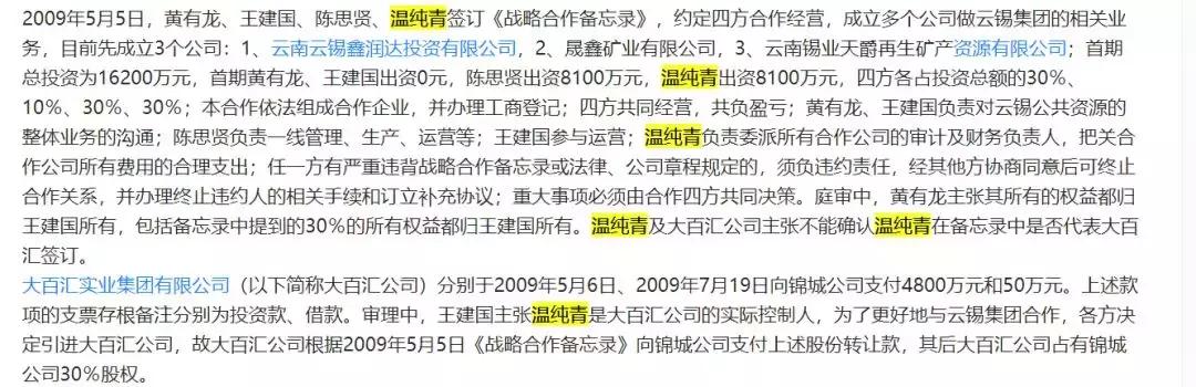 为了更好地与云锡集团合作,这三方又决定引进温纯青和他的大百汇实业集团有限公司。温纯青支付了4850万,持有锦城公司30%的股份。
