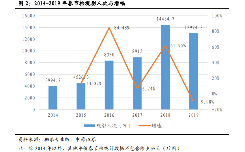 以2019年春节档为例,2019年春节档观影人次为1.30亿,同比下降10%,而2014-2018年,观影人次逐步增长。