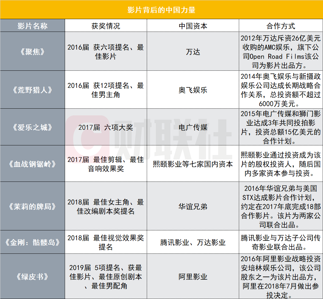 据财联社观察,在近三年的奥斯卡获奖影片中,中国资本频频现身,里面不仅有华谊兄弟这样的专业影视公司,也有奥飞娱乐这样的逐步涉足影视的“外行”公司。