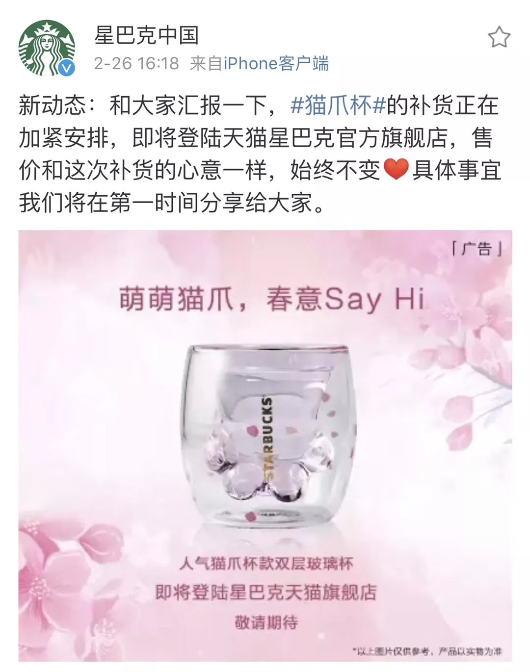 很快,星巴克中国官微也发来了回复,称猫爪杯正在补货,并表示价格不会改变: