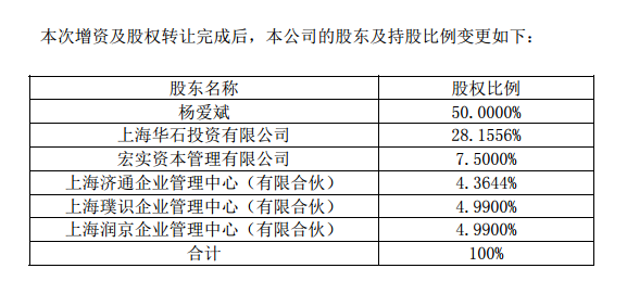 新增的注册资本由已有股东杨爱斌、宏实资本及新增股东上海济通企业管理中心(有限合伙)认购并已实缴。新增股东上海璞识企业管理中心(有限合伙)及上海润京企业管理中心(有限合伙)作为受让方,分别受让已有股东上海华石投资有限公司持有的本公司4.99%和4.99%的股权。