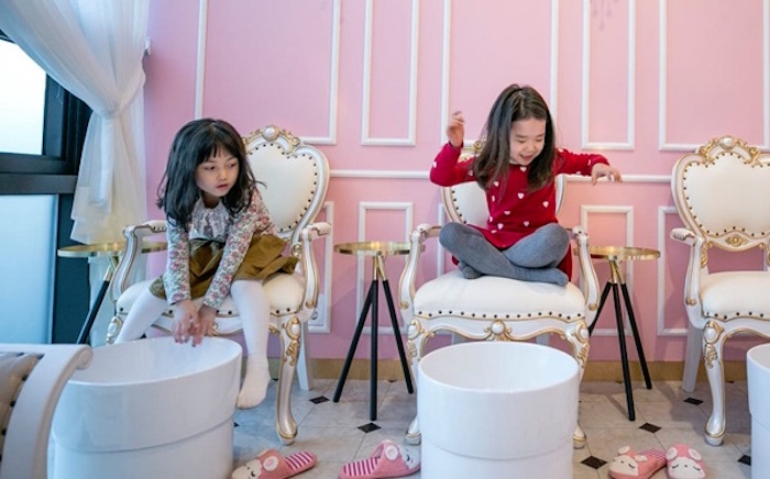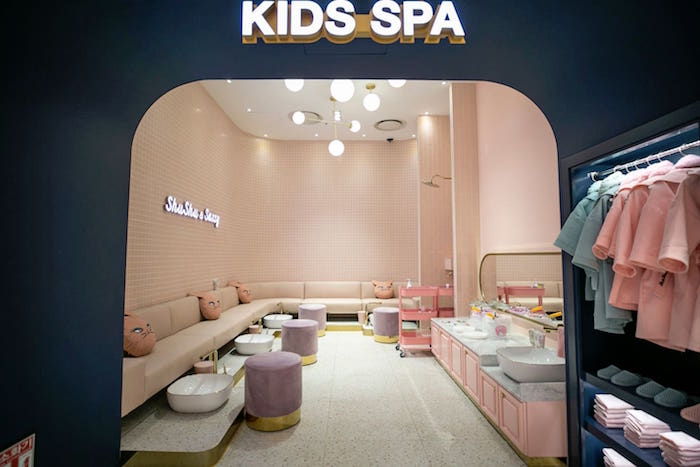 以ShuShu Cosmetics为例,这个成立于2013年的品牌声称专为儿童提供“更健康”的美妆产品,比如“水溶性指甲油”以及用食用天然色素制作的“无毒性唇彩”等。该品牌不仅在韩国开出了19家门店,还开设了“儿童水疗美容中心”,主要为4-10岁的女孩提供spa、足疗、面部护理与化妆、手部护理等服务。