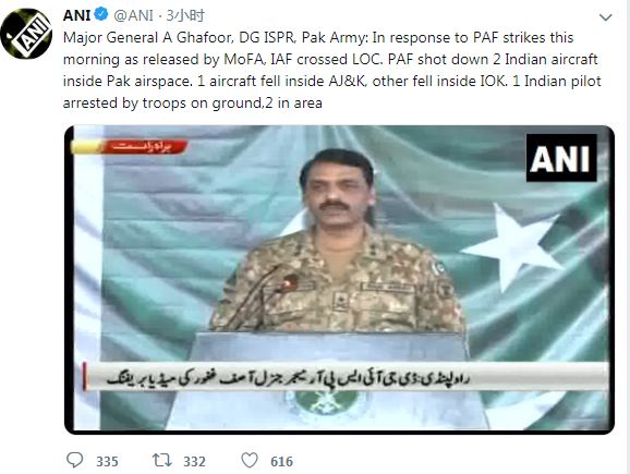 据印度亚洲国际新闻通讯社(ANI)报道,巴基斯坦军方发言人加富尔少将(Major General A Ghafoor)表示,作为对印度跨过印巴实控线(LoC)发动空袭的回应,巴基斯坦空军在巴控克什米尔上空击落两架印度飞机,一名印度飞行员被俘。加富尔稍后在新闻发布会上更新了数字,称有两名飞行员被抓,并向他们“提供了所需的治疗”。