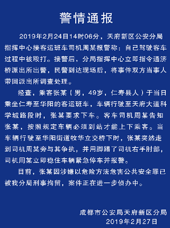 据成都市公安局天府新区分局官方微博消息,2月24日,在仁寿至华阳的客运班车上,男乘客张某在未到站的情况下强行要求下车,遭到司机拒绝。张某突然走到司机旁边,脚踢司机右手肘部。事发后,司机立即稳住车辆并停车报警。