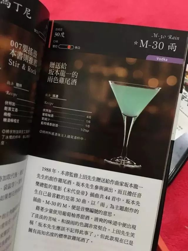 银座调酒师中还有一位我喜欢的上田先生。一次雨夜,我推开酒吧门坐下,六十多岁的上田老爷子知道我是中国人,看见我的脸色,笑嘻嘻地翻出一本书,指着一款酒跟我说:“来杯这个吧。这杯酒特别应景,叫M30-Rain。”