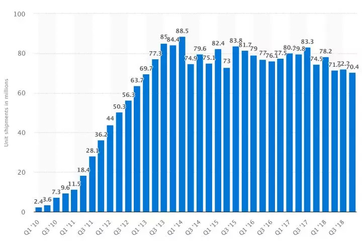 三星 Galaxy S 系列历年出货量 2010-2018 | 图:Statista