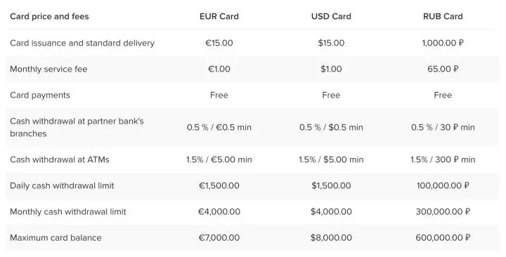 Cryptopay 预付费卡片费率及限额 | 图:Cryptopay