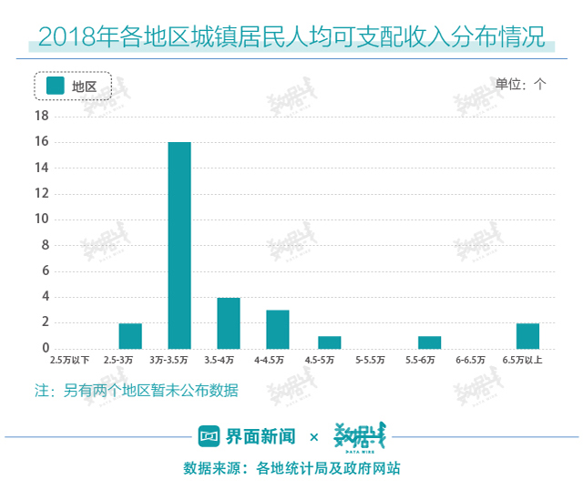 从城镇居民人均可支配收入总体情况来看,多数地区集中在3万至3.5万元之间(共计16个)。