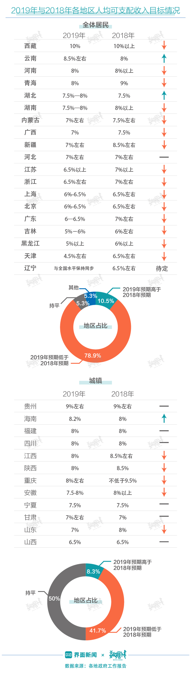 从城镇居民人均可支配收入增长目标情况来看,下调2019年目标的地区占比达41.7%,上调地区占比为8.3%。