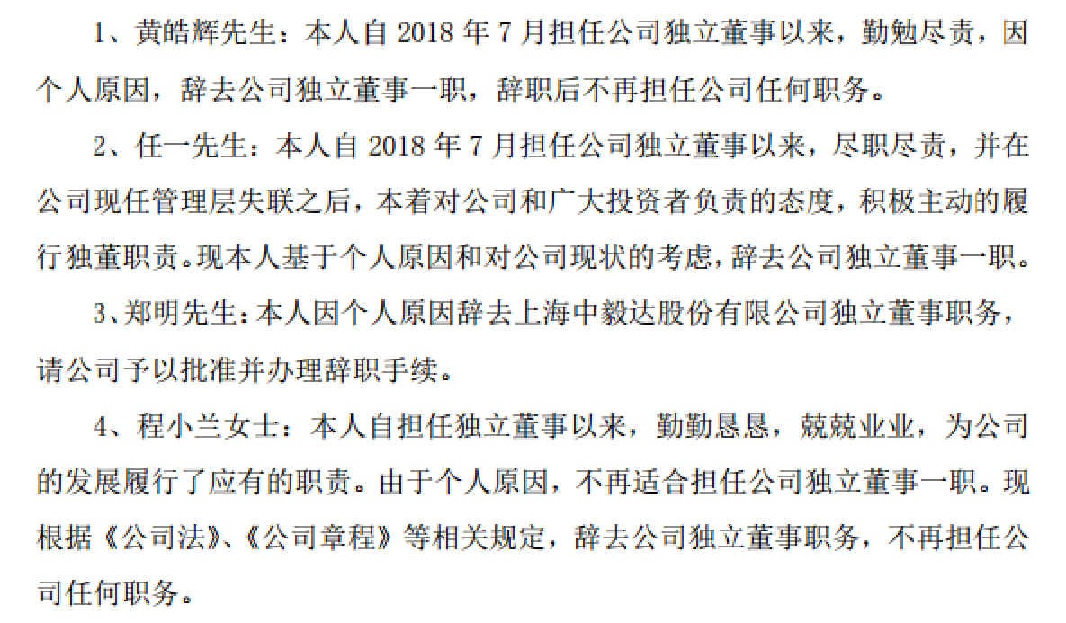 2019年2月27日*ST毅达公告称,公司独立董事黄皓辉、任一、郑明、程小兰于2019年2月25日提出辞去独立董事一职,至于离职的理由,全系“个人原因”。