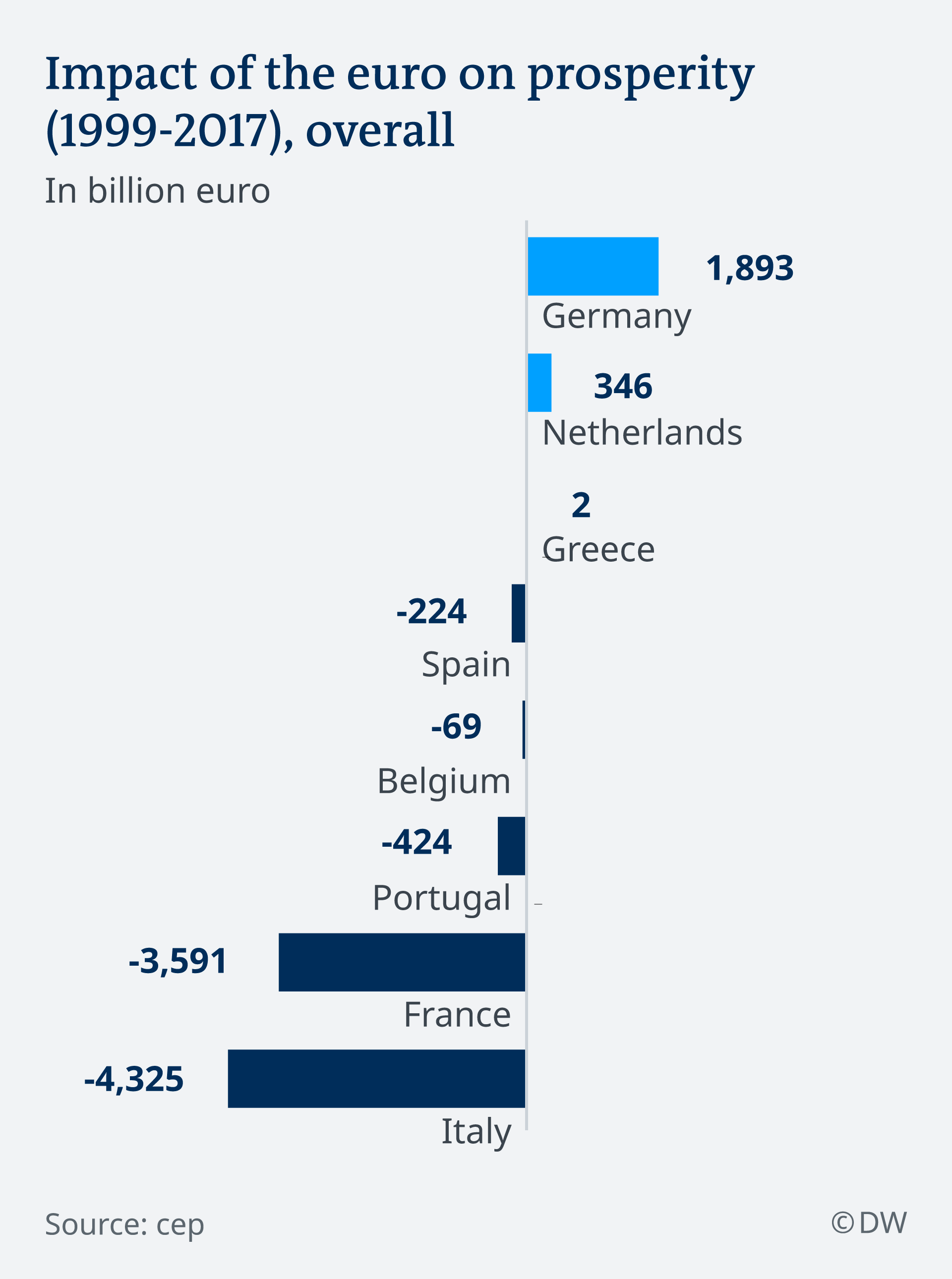 据德国之声报道,德国的欧洲政治中心(CEP)本周一发布了题为《欧元20年:赢家和输家》(20 Years of the Euro: Winners and Losers)的报告,研究了欧元的引入对各成员国经济繁荣程度的影响。报告发现,欧元引入至今的20多年间,19个成员中只有德国和荷兰受益比较大,而意大利和法国等其他成员国的经济繁荣程度则出现下降。