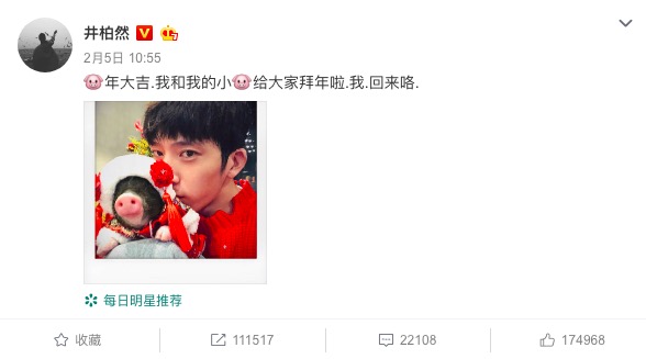 看起来,“养猪”是比养猫养狗更能在社交网络上吸引眼球的存在。久未在微博上露面的井柏然抱着他的宠物猪“佩奇”回归,他在抖音上专门开设记录养猪日常的账号,已经有了超过77万的粉丝。