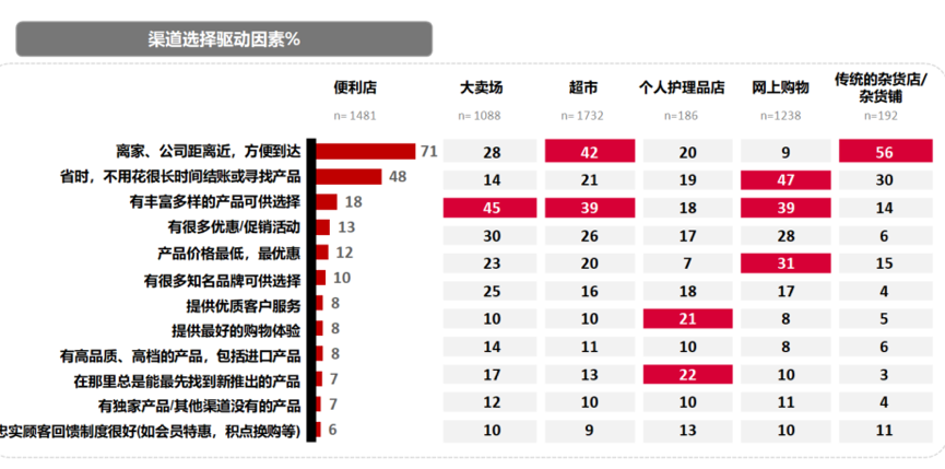 尼尔森研究发现,“方便到达”成为购物者对于线下渠道的普遍要求。其次,“省时的产品寻找”及“丰富的产品选择”均对线上渠道及线下渠道的购物行为有较大驱动作用。