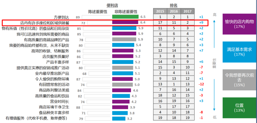对便利店来说,“店内有可供就餐的区域”的重要性相较同期有明显提升。除满足基本购物需求外,购物者对便利店“可以提供愉快购物体验”的诉求也有了明显提升。