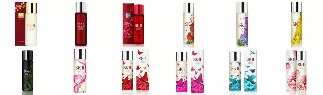 神仙水一贯简洁优雅的半透明玻璃瓶身坚持了几十年,但自2008年开始,SK2每年都会推出神仙水限量版,诸如2008年首个纪念品牌28周年的限量版,2013年的限量钻石瓶等等。
