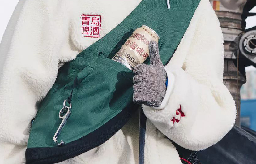当然,只在衣服上印上标语只能算是联名设计中的基本动作,这次青岛啤酒的联名里比较有意思的地方在于,这两件衣服都搭配了能把啤酒穿在身上的斜跨腰包,而腰包的拉链还可以直接当瓶起子,让你“随身随地带啤酒,走着走着就能开”,实现了设计感和实用性的高度结合。