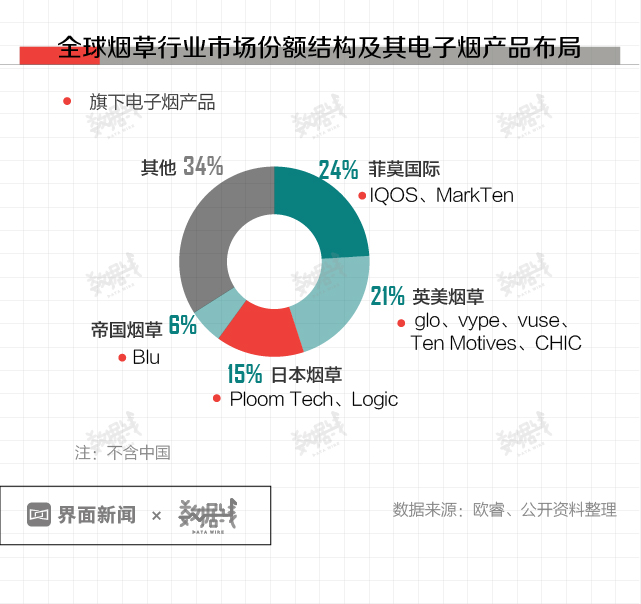 在全球烟草行业中,菲莫国际、英美烟草、日本烟草、帝国烟草四大跨国烟草企业市占率近 66%。各大烟草企业加速布局电子烟,相继推出多种电子烟产品。
