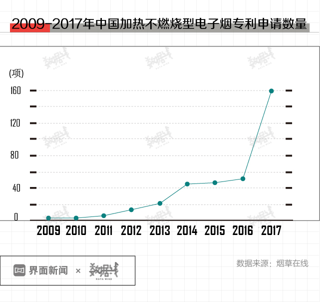 虽然与跨国烟草集团相比,中国电子烟的研发水平还有较大差距,但国内企业正加快新型烟草产品研发的步伐。根据烟草在线数据,2017年中国加热不燃烧型电子烟专利申请数量大幅增加。