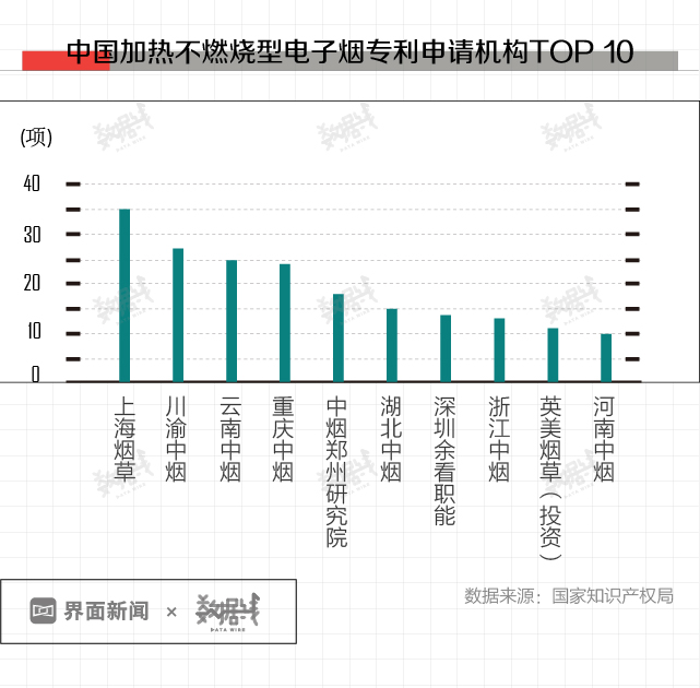 从申请机构来看,中国加热不燃烧型电子烟专利申请机构以大型烟草公司为主,上海烟草、川渝中烟和云南中烟的专利申请数量排名前三。