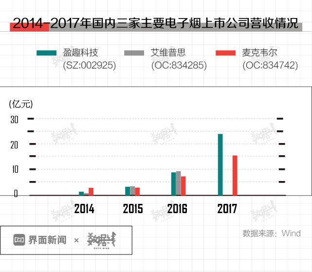 全球电子烟制造端 90%在中国,近几年中国新型烟草制造商营业收入大增。2014-2017年,国内三家主要电子烟上市公司(麦克韦尔、盈趣科技、艾维普思)收入复合增长率平均190%。