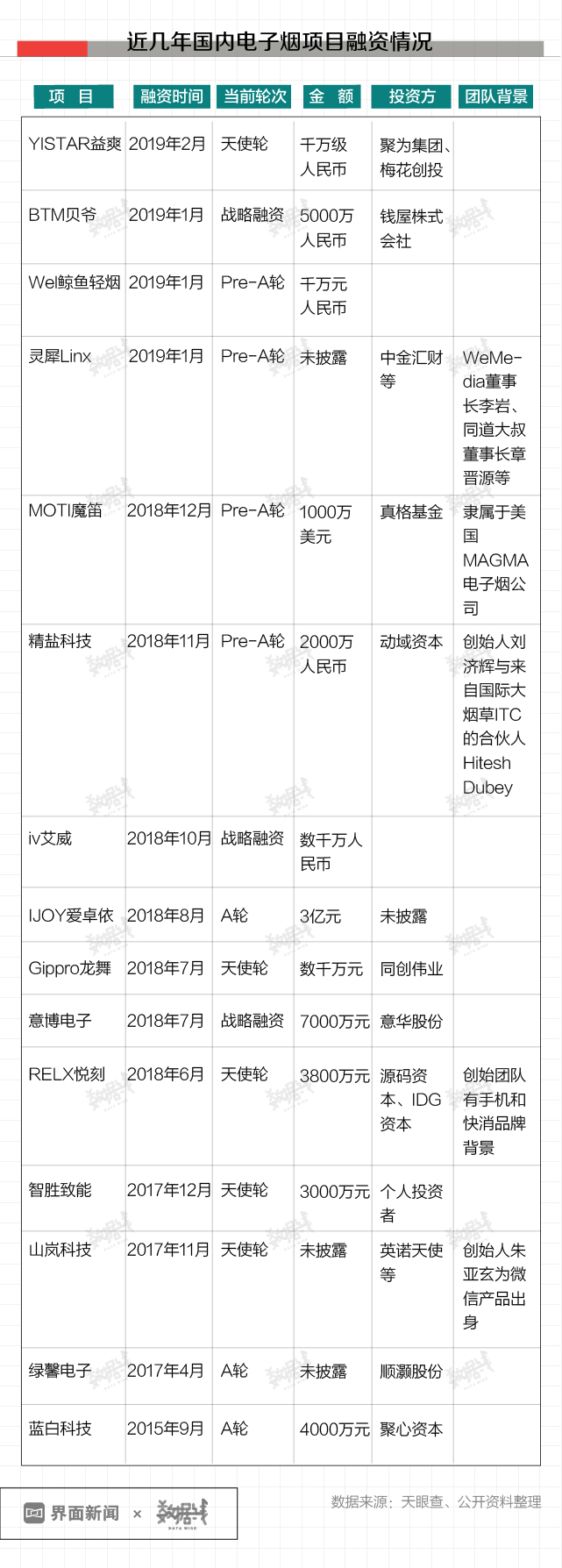 据界面数据(公众号ID:shujuxian_kuaikan)不完全统计,2019年前两个月已至少发生4起电子烟项目融资,金额均在千万级别。