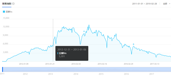 豆瓣FM的搜索指数逐年下滑,2018年4月,豆瓣音乐从豆瓣网分拆的消息传出,与音乐版权服务平台V.Fine 合并重组为DNV音乐集团。合并后,豆瓣为新公司最大股东,豆瓣还表示,将继续在产品、流量、品牌、运营等方面为新公司提供全力支持,坚持豆瓣音乐的品牌调性,在产品和商业化方面与新公司探索更多的可能性。