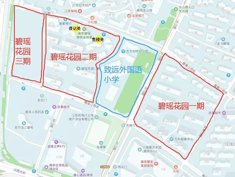 碧瑶花园内建致远外国语小学分校,北侧为郦城御园和金马郦城,南侧为苏宁滨江壹号,西侧临近扬子江大道和绿博园;