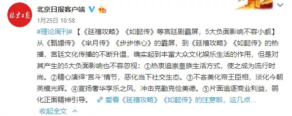 类似的事件早在年前就有过一波预演。1月25日,北京日报刊文批宫斗剧五宗罪:①热衷追崇皇族生活方式,使之成为流行时尚。②精心演绎“宫斗”情节,恶化当下社交生态。③不吝美化帝王臣相,淡化今朝英模光辉。④宣扬奢华享乐之风,冲击克勤克俭美德。⑤片面追逐商业利益,弱化正面精神引导。