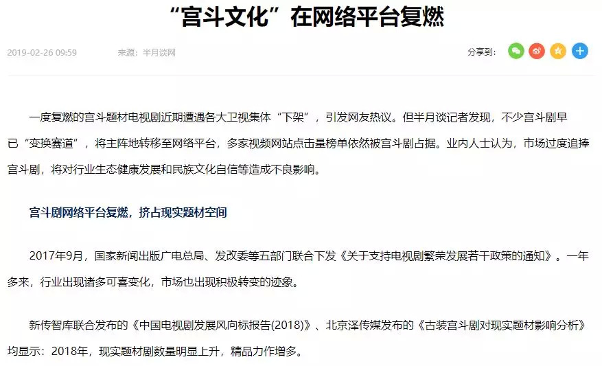 事实上,早在这份通知流传之前,限制宫斗、权谋戏就早有征兆。2月26日,党媒《半月谈》刊文《“宫斗文化”在网络平台复燃》。文中点名批评了《延禧攻略》《如懿传》等网剧,并细数了宫斗戏的三宗罪:挤占现实题材空间、推高版权价格、传递错误价值观。