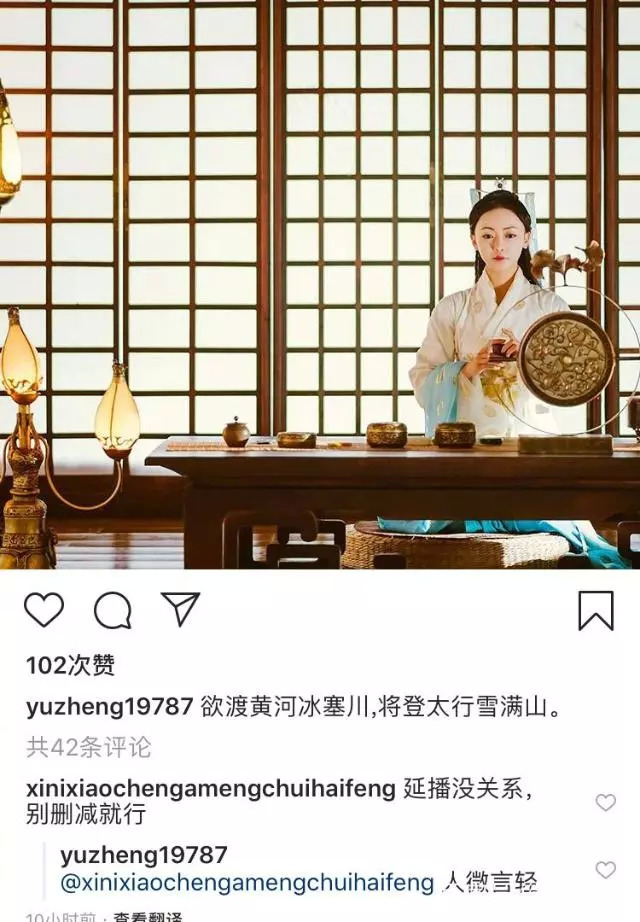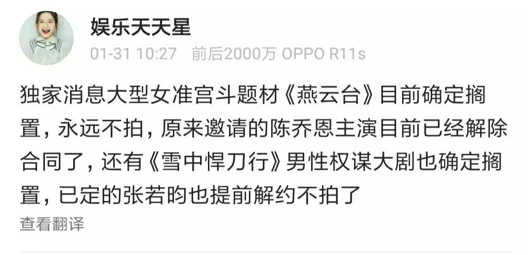 再往前,《皓镧传》《东宫》和《长安十二时辰》的相继延播,也预示着限古令已经波及到网剧。尤其是宫斗元素最多的《皓镧传》,原定于2018年11月15日在爱奇艺独播,开播前两天发布会紧急取消,宣布延期。一个月过去后依然杳无音信。有人在ins上询问,于正表示:人微言轻。