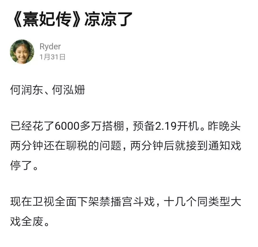 同样是在1月31日,豆瓣鹅组也有人爆料《熹妃传》凉了。《熹妃传》由同名清宫小说改编,阐述了后妃之间的宫闱斗争,描绘了一代帝后的爱恨缠绵。