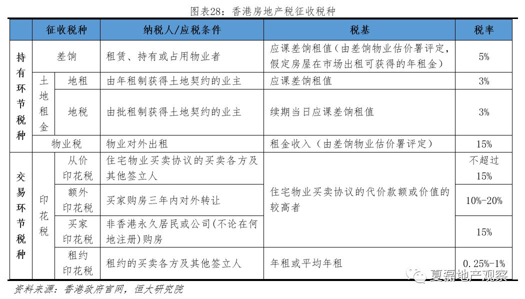 近年来,房地产持有环节的差饷税占财政收入比重一般稳定在4%左右,物业税维持在1%左右,土地年租大约2%左右,房地产交易环节的印花税一般占财政收入比重的3%左右。