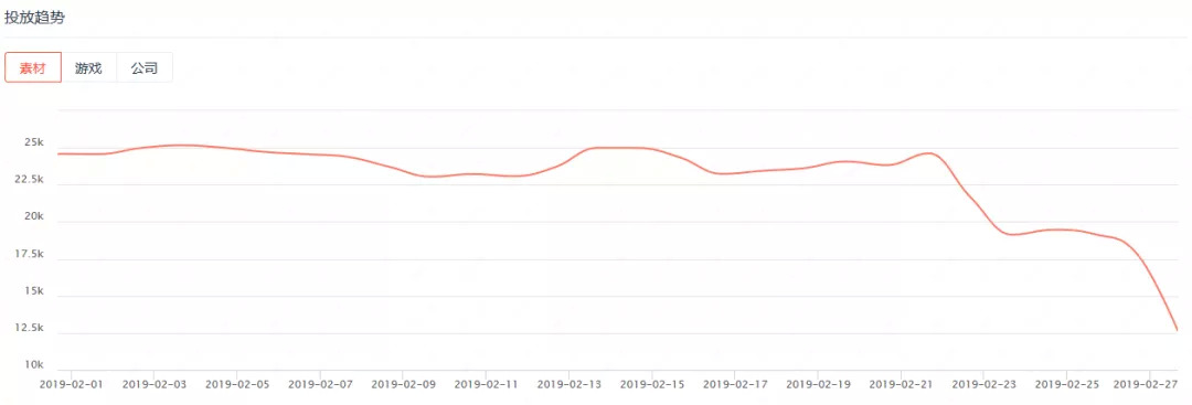 整体来看,或许是受到春节档的影响,整个2月份的买量市场都处于一个相对平稳的状态,但是与1月份的数据相比有着较大幅度的下滑。每天的投放素材数基本保持在2万到2.5万组之间,投放游戏数基本保持在1000款以上,而参与买量的公司数基本保持在250家以上。值得关注的是,这三项数据在月末开始出现了下跌趋势,有可能会延续到3月份的买量大盘。