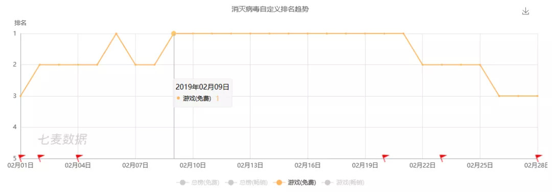 回顾今年的春节档,《消灭病毒》可以说是最大的黑马。这款休闲“打飞机”游戏在2月1日便空降App Store游戏免费榜TOP3,随后一路高歌猛进,挤下《刺激战场》坐上了TOP1的位置。七麦数据显示,《消灭病毒》自2月9日拿下TOP1之后,便持续了为期13天的霸榜,整个2月份游戏下载量将近730万。