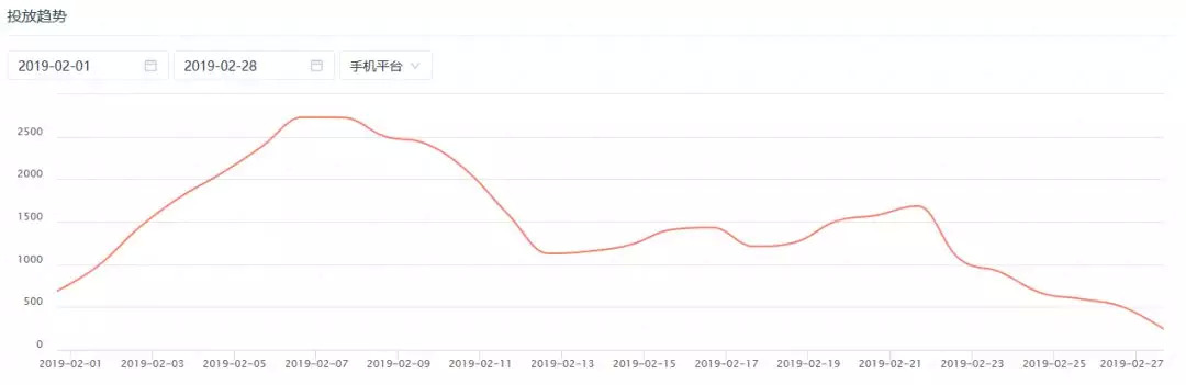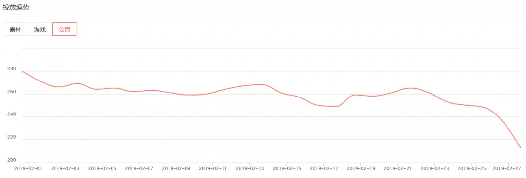 虽然整个2月份买量市场处于相对稳定的状态,但是与1月份相比,2月份参与买量的公司数有着较大幅度的下滑。1月份的参与买量公司数基本保持在300家以上,单日最高有327家公司参与买量,而2月份单日最高仅有280家公司参与买量。