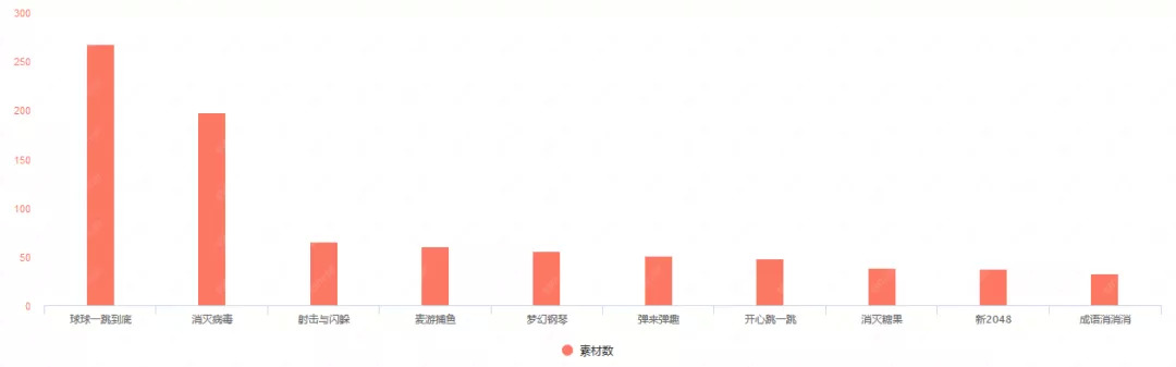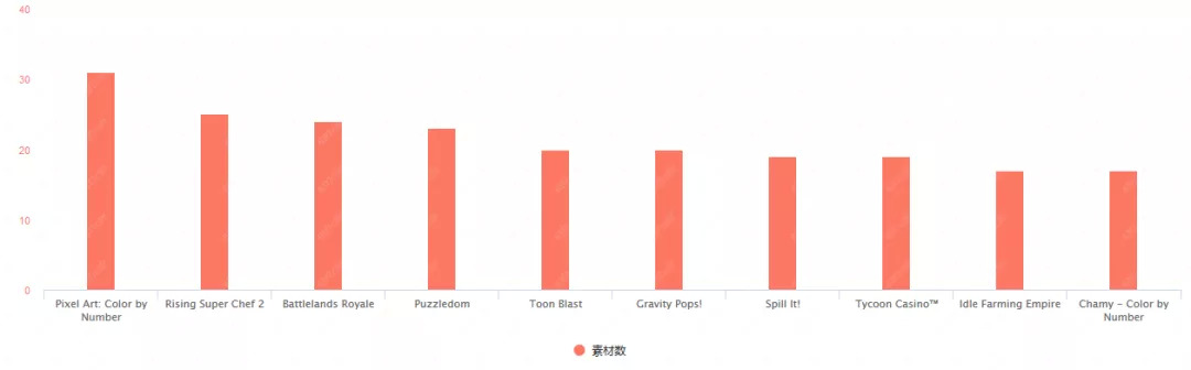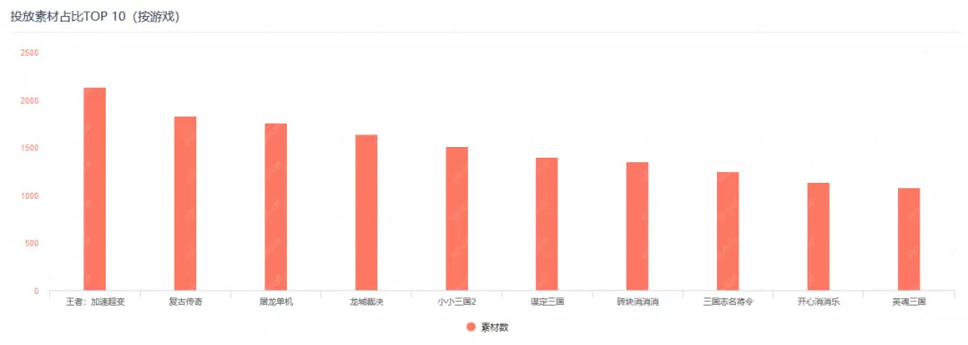 以投放素材数来进行对比,2月份的TOP10行列头部与尾部的投放量差距较大。拿下TOP1的《消灭病毒》投放素材数高达7114组,几乎是第二名《砖块消消消》的3倍,而排在TOP10的《复古传奇》投放素材数仅1161组。