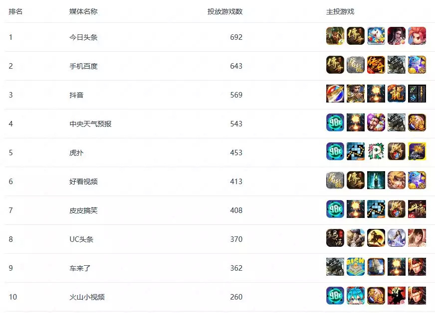 在投放公司数排名、投放游戏数排名、投放新游数排名这三个榜单上,除了腾讯广告这类头部的传统买量渠道之外,近年来出现的新兴渠道在本月拿下了非常不错的成绩。今日头条拿下了三榜第一,抖音则超越手机百度拿下了投放公司数TOP2的位置。