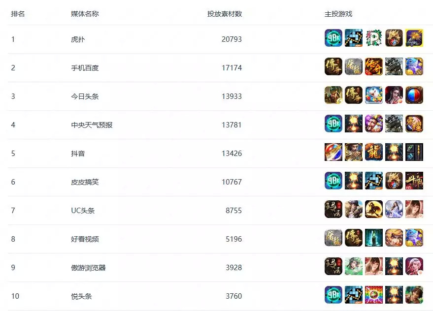 除了排名行业第一的腾讯广告之外,按照投放素材数划分,令人感到意外的是,虎扑渠道以20793组的投放素材数拿下了TOP1的位置,力压手机百度、今日头条等热门渠道。在虎扑上投放广告的游戏以休闲类和传奇类为主,投放力度TOP5的产品分别是《消灭病毒》、《砖块消消消》、《paint.ly》、《一刀传世》和《车枪球大消除》。