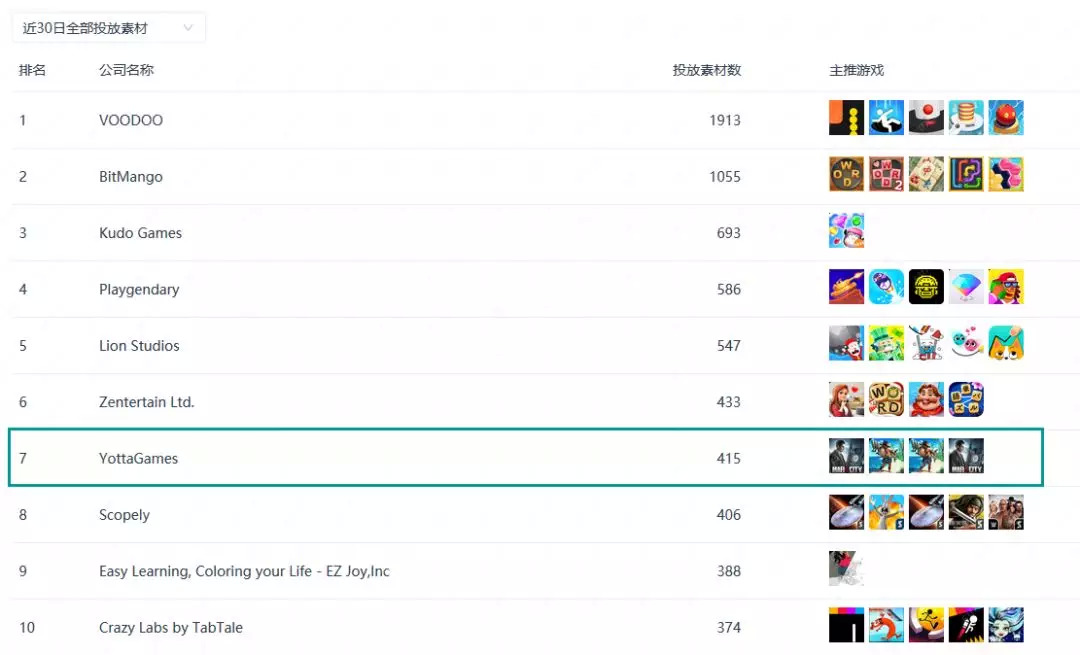 按照投放素材数划分,本月参与买量的游戏公司TOP10中仅有一家中国厂商上榜,为拿下第7名的友塔游戏,主推游戏为《黑道风云》。此外,著名的超休闲游戏厂商Voodoo以1913组的投放素材数拿下TOP1。整体来看,TOP10买量公司中大部分均主推休闲类产品,比如以超休闲游戏打开市场的Voodoo、Playgendary、Lion Studios均处于买量头部位置。