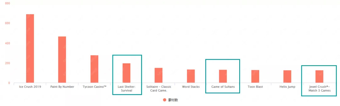 2月份的美国市场投放力度TOP10的产品排行中,有3款国产手游上榜。龙腾简合的《Last Shelter: Survival》拿下TOP4的位置,投放素材数为196组;梦加网络的《苏丹的复仇》拿下第7名,投放素材数为132组;《Jewel Crush》(宝石消消乐)则以127组的投放素材数排在第十。