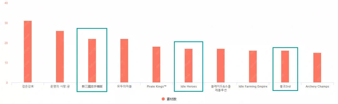 在韩国市场的投放力度TOP10产品排行中,也出现了三款国产手游。BBGame发行的《新三国志手机版》拿下TOP3,投放素材数为22组;《放置奇兵》拿下第6名,投放素材数为17组;《崩坏3》则拿下了第9名,投放素材数为16组。