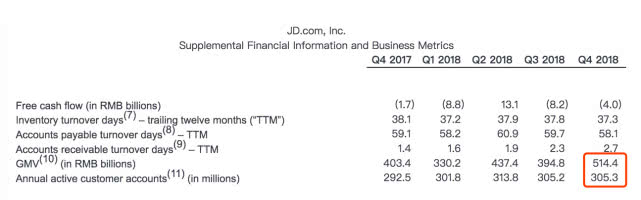京东特别在财报中额外强调了2018年第四季度和第三季度的季度活跃用户数,分别同比增长20%和22%,CFO黄宣德在电话会中透露,四季度的活跃用户数环比增长约6%,“拿去年第三和第四季度举例,就是想展示公司活跃用户还是有向上增长的趋势。”